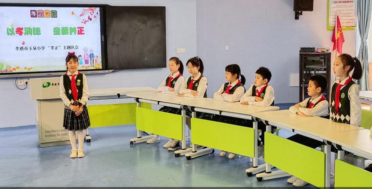 湖北省孝感市孝南區(qū)玉泉小學(xué)主題隊(duì)會(huì)現(xiàn)場?!白鳛橐幻聲r(shí)代的少先隊(duì)員,我們應(yīng)該尊敬師長,孝敬父母,關(guān)愛他人,用實(shí)際行動(dòng)做到知孝行孝揚(yáng)孝......