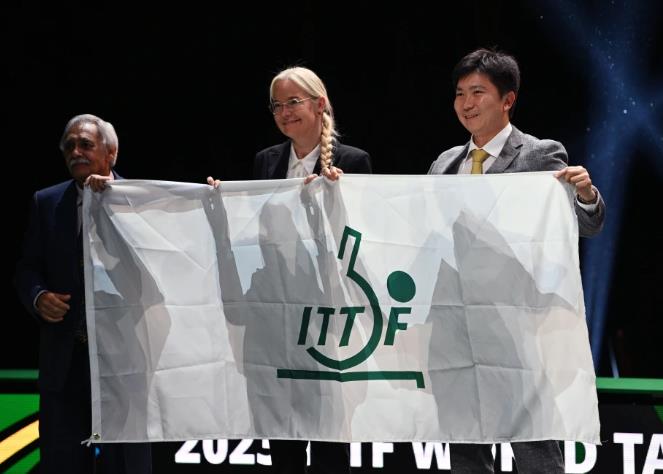 當日,在南非德班進行的2023年世界乒乓球錦標賽閉幕。5月28日,下屆世乒賽主辦國代表、韓國乒協(xié)主席柳承敏(右)舉起“埃及杯”?!鞍?.....