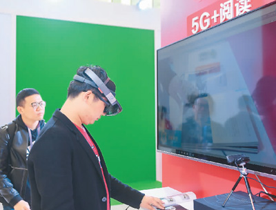 觀眾在數(shù)字閱讀發(fā)展與技術(shù)博覽會上體驗5G+閱讀。 新華社記者黃宗治攝 給讀者帶來沉浸式體驗 戴上VR(虛擬現(xiàn)實)設(shè)備看......