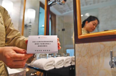 11日,北京人衛(wèi)酒店,保潔員將環(huán)保提示牌放置在衛(wèi)生間。北京人衛(wèi)酒店洗衣房,工作人員將沒(méi)用完的一次性香皂收集再利用。酒店“六小件”,泛......
