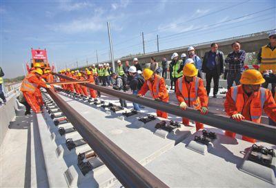 4月15日,北京至雄安新區(qū)城際鐵路北京段——李營至新機(jī)場站施工現(xiàn)場,工人正在進(jìn)行鋪軌作業(yè)。新京報(bào)記者王貴彬攝9月底前,京雄城際鐵路(......