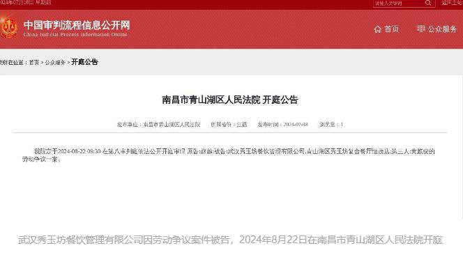 據(jù)中國審判流程信息公開網(wǎng)消息,江西省南昌市青山湖區(qū)人民法院于2024年8月22日09:30在第八審判庭依法公開開庭審理武漢秀玉坊餐飲......