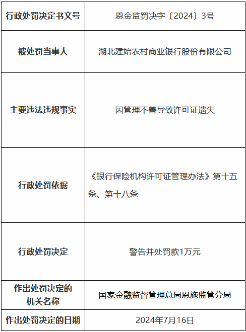 許可證遺失湖北建始農(nóng)商銀行被罰款1萬元