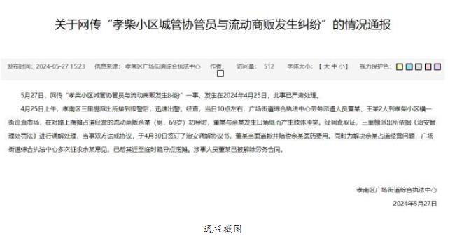 據(jù)湖北孝感孝南區(qū)政府網(wǎng)站消息,孝南區(qū)廣場(chǎng)街道綜合執(zhí)法中心發(fā)布關(guān)于網(wǎng)傳“孝柴小區(qū)城管協(xié)管員與流動(dòng)商販發(fā)生糾紛”的情況通報(bào)。5月27日,......