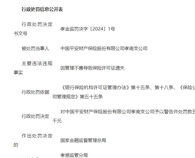 國家金融監(jiān)督管理總局孝感監(jiān)管分局行政處罰信息公開表行政處罰決定書文號(hào)孝金監(jiān)罰決字〔2024〕1號(hào)被處罰當(dāng)事人中國平安財(cái)產(chǎn)保險(xiǎn)股份有限......